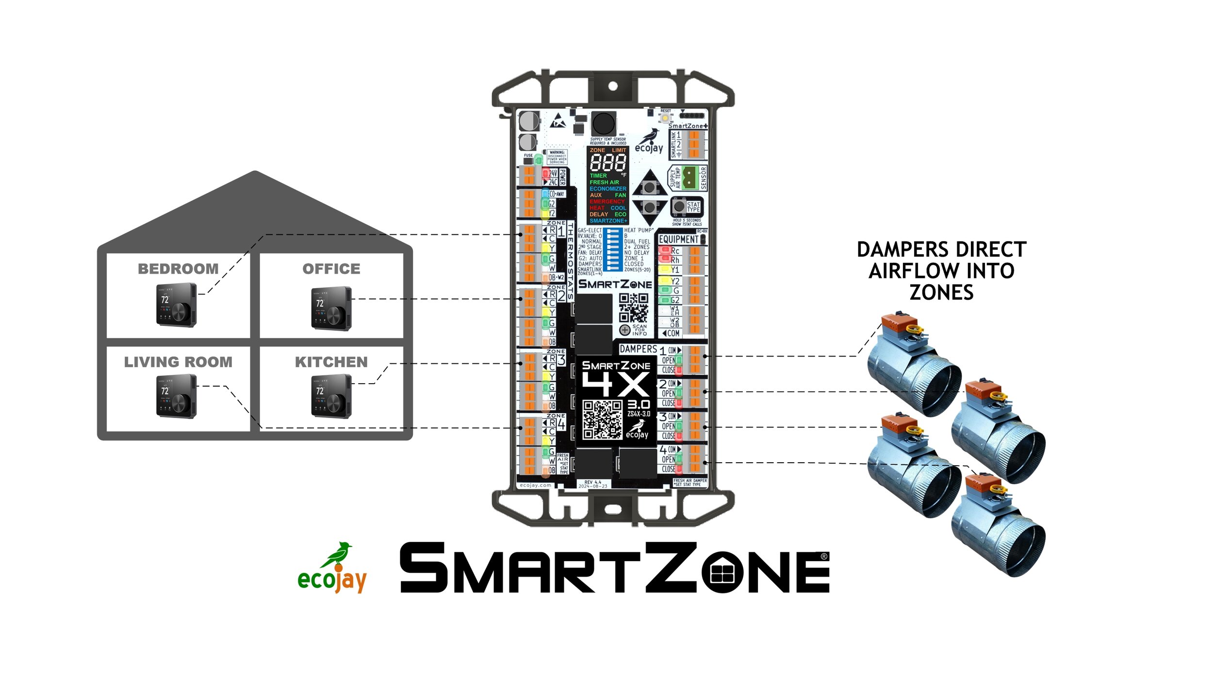 Simply put, Zoning works by using a zone panel (SmartZone) to control the HVAC equipment when thermostats in each room need heating or cooling. The zone panel also controls dampers that open and close in the ductwork to direct airflow where needed by the thermostats. Watch the video below for more about how smartzone works.